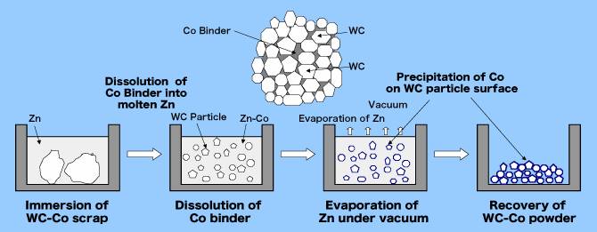 Quando restos de WC-Co são mergulhadas em um banho de zinco fundido, o zinco fundido começa a penetrar entre as partículas de WC e dissolver o ligante de Co, nesta dissolução do Co que se mistura com o Zn, o WC se separa e fica independente e flutua no material derretido Zn-Co. Uma vez que o zinco possui uma alta pressão de vaporização, o zinco é removido facilmente em condições vacuo após a separação das partículas de WC. Como o zinco evapora sob vacuo, o teor de Co aumenta gradualmente e o metal Co tende a precipitar sobre a superfície da liga WC derretido. Quando o zinco evapora completamente, todo o Co precipita na superfície das partículas de WC, resultando em pós de WC-Co com a mesma composição química original como o pó antes da sinterização.